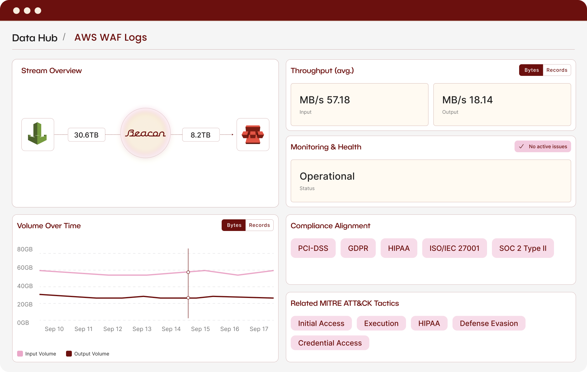 Beacon's security-driven data platform optimizes terabytes of important security logs spanning many sources. Data arrives enriched and normalized, and in the case of bloated VPC flow logs, reduced to 5% of their original size, enabling our security team and AI workflows to act immediately and effectively. We no longer choose between coverage and cost efficiency. We now have both, supported by a responsive team of security data experts.