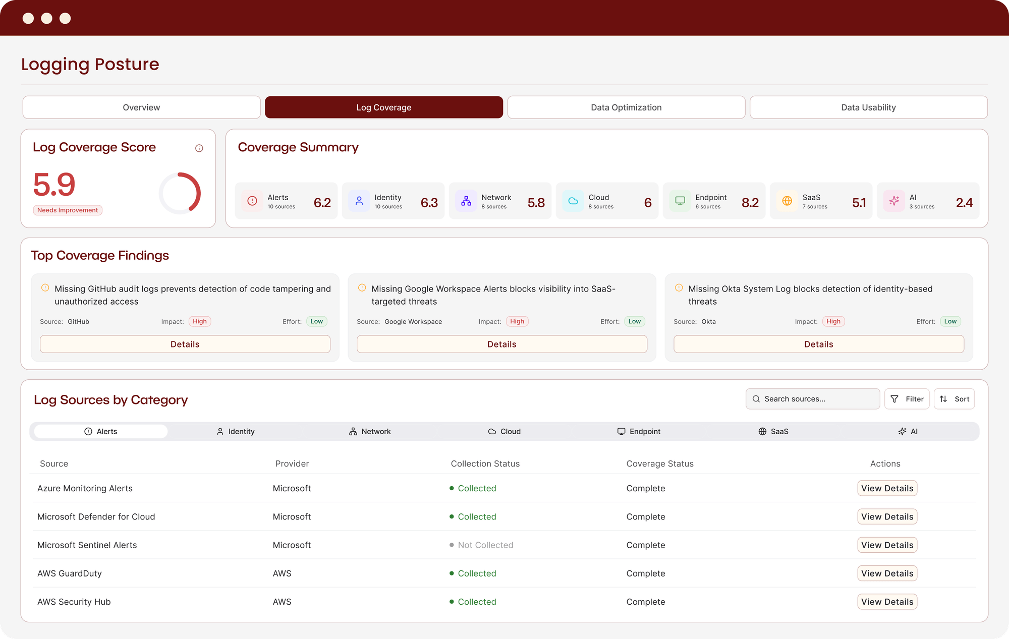 Security data coverage refers to how completely your environment is logged: which sources are actively collected, normalized, and available for detection and investigation. Poor coverage means threats can move through unmonitored systems without triggering alerts, and investigations hit dead ends where data should have been.